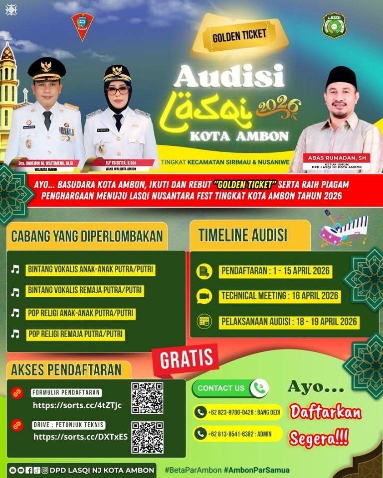 Ambon, News Medianusantara.com - Untuk membina potensi generasi muda dalam seni Islami, membentuk karakter mental dan spiritual, serta memperkuat ekosistem ekonomi kreatif dan seni untuk mendukung Ambon sebagai Kota Musik, Lembaga Seni Qasidah Indonesia (LASQI) Nusantara Jaya Kota Ambon secara resmi mengumumkan pembukaan audisi vokalis yang menyasa...